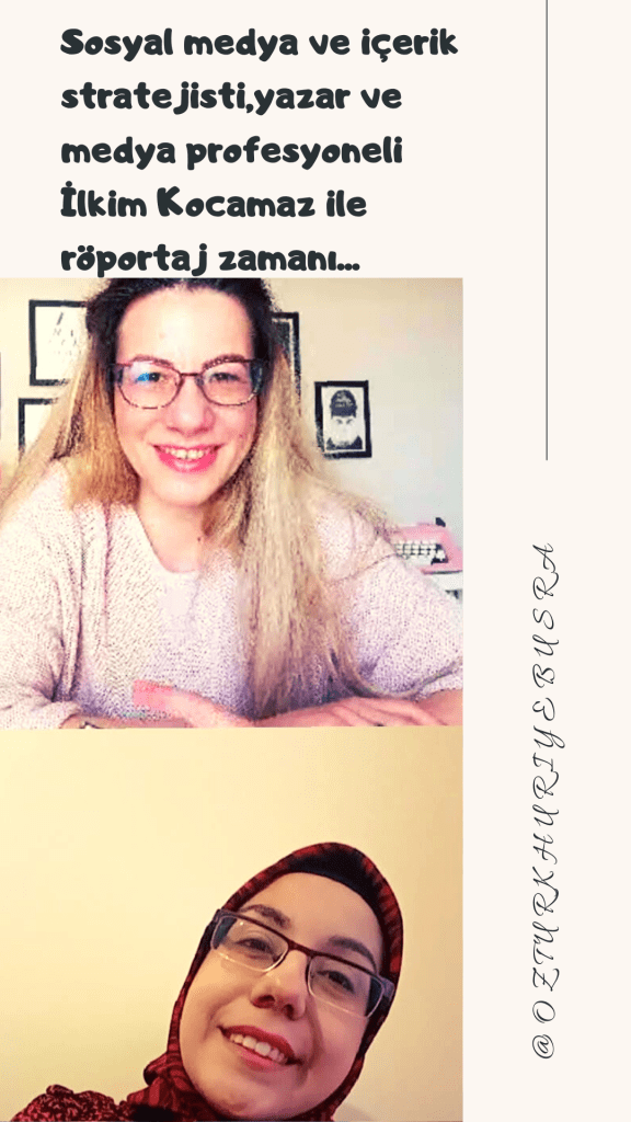 Merhaba sevgili okurlarım.Bugün sosyal medya ve içerik stratejisti,yazar ve medya profesyoneli İlkim Kocamaz ile yaptığımız harika bir röportajı size aktaracağım.Ben kendisini dinlerken çok keyif aldım.Umarım siz de okurken çok keyif alırsınız:)